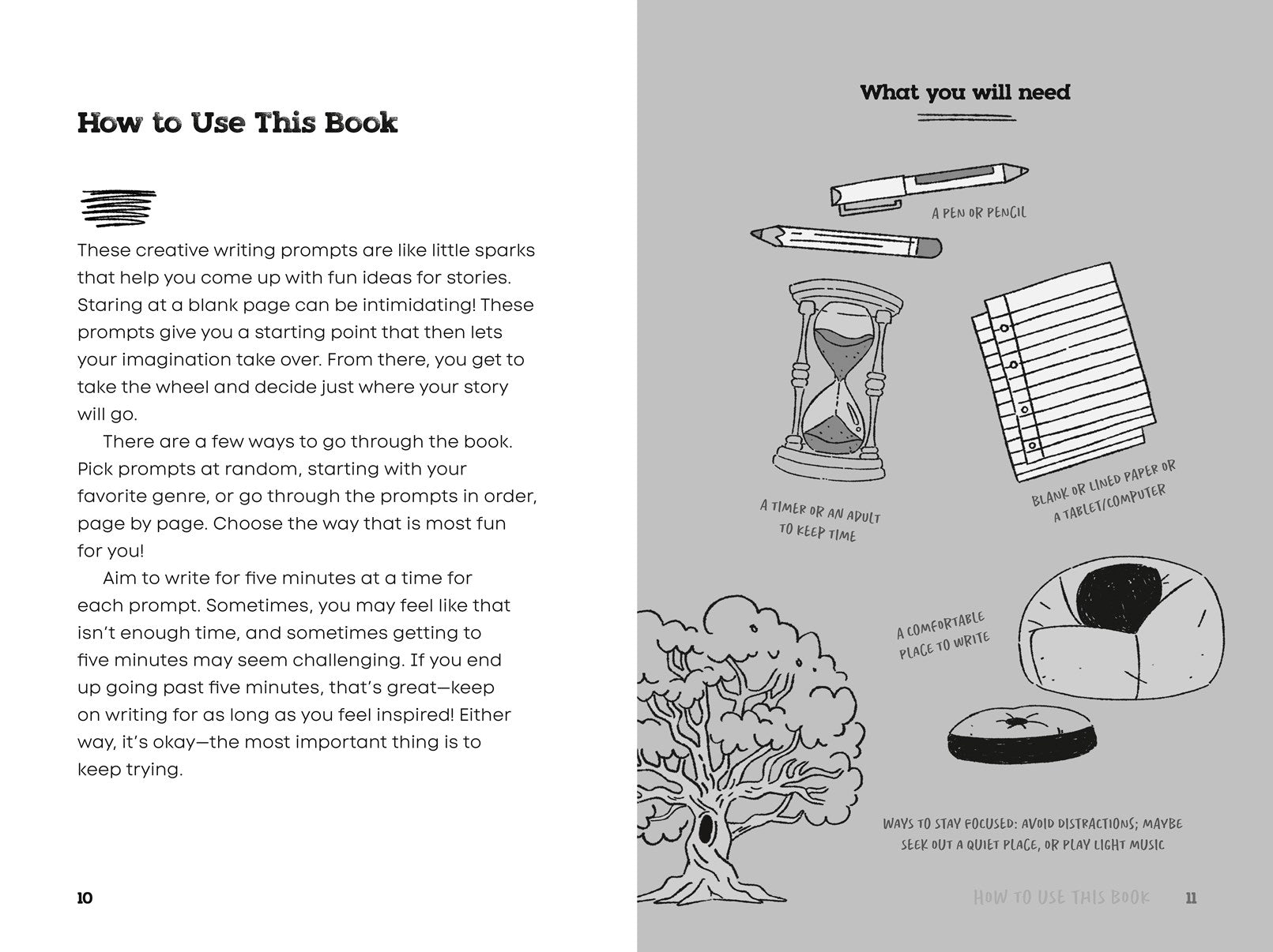 - Creative and engaging prompts: From fantastical quests to robot pets, each prompt invites new ideas and boundless creativity, exploring the realms of fantasy, mystery, autobiography, and more! Prompt “twists” challenge young writers to take their story further or view them from a new angle.