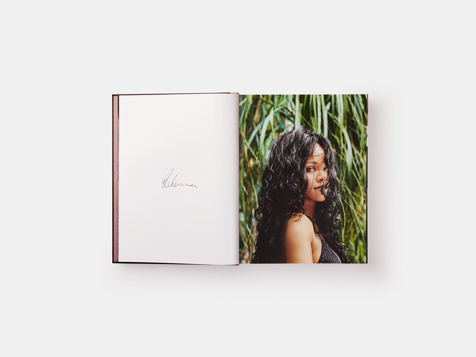 Rihanna: Queen Size is hand-sewn and bound in bespoke padded Japanese-designed fabric with a pearlescent finish, and an embedded, matte black, laser-cut steel logo designed by Barnbrook studio. The endpapers feature a custom design by The Haas Brothers printed in spot gloss on a rich black paper stock. Rihanna's remarkable story unfolds in 504 pages and more than 1,000 images along with gatefolds and special inserts including bound-in booklets, a die-cut tip-in sheet, and a double-sided removable poster.