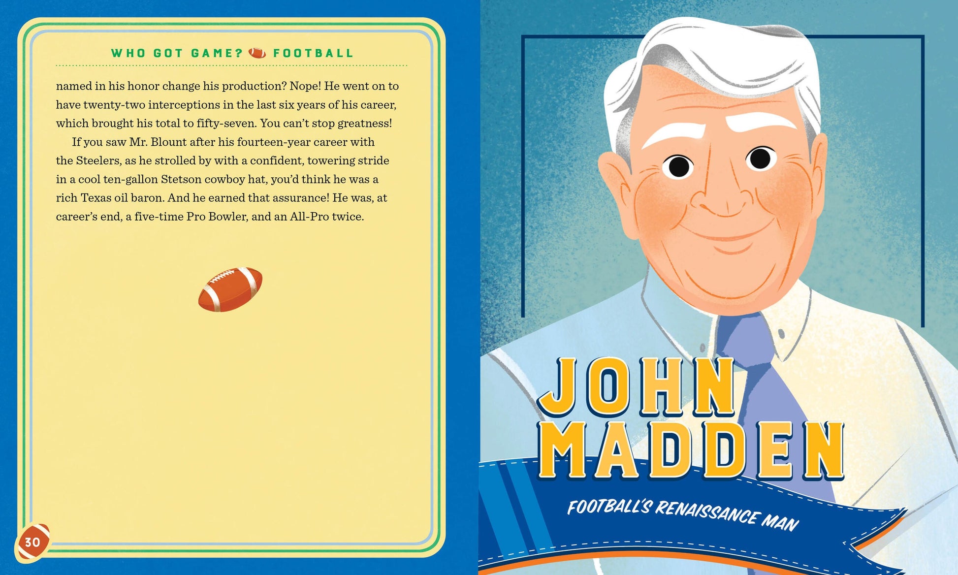Football rules America. It's the favorite child (like you), it's the teacher's pet, it's the grandkid that Granny bakes all of the cakes, cookies, and pies for. But while you might know all the latest, do you know the GREATEST? The players, coaches, change agents, and all-out legends who made the National Football League what it is today? We're talking about Tom Brady--the sixth-round quarterback, passed up by every team in the league, who ended up becoming the G.O.A.T. Joe Horn, who hid a cell phone in the goalpost and used it after he scored a touchdown--because he was that confident he could get to the end zone. Jim Thorpe, Peyton Manning, Orlando Jones, Mel Blount . . . They're all here for you to discover.